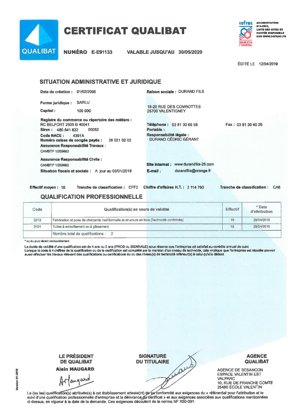 Nous sommes labellisés QUALIBAT pour les activités de charpente et de couverture.